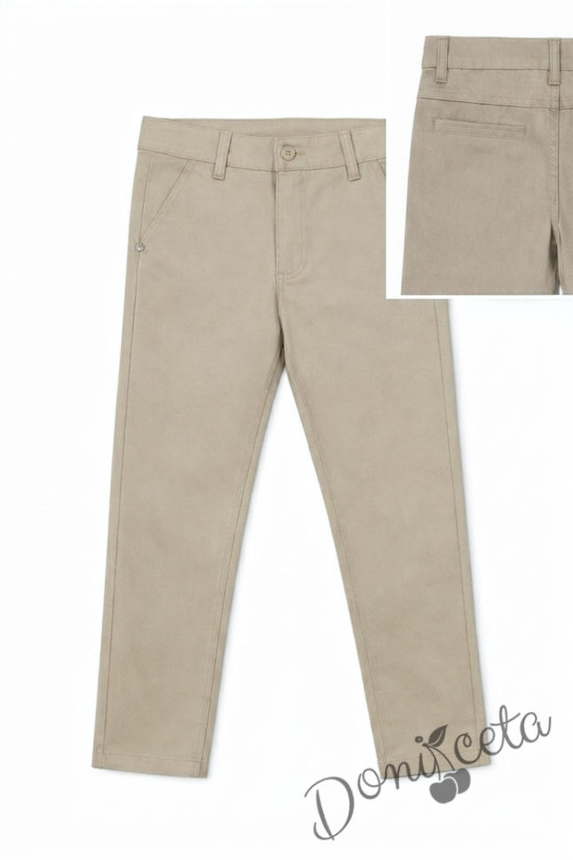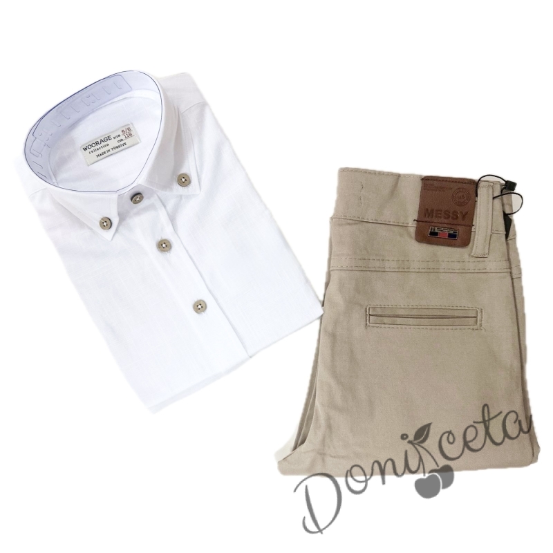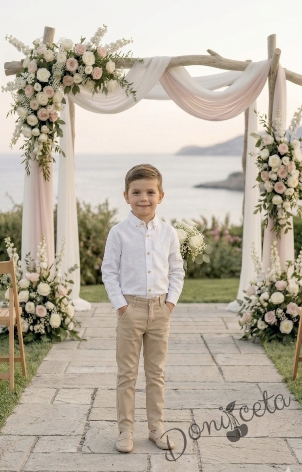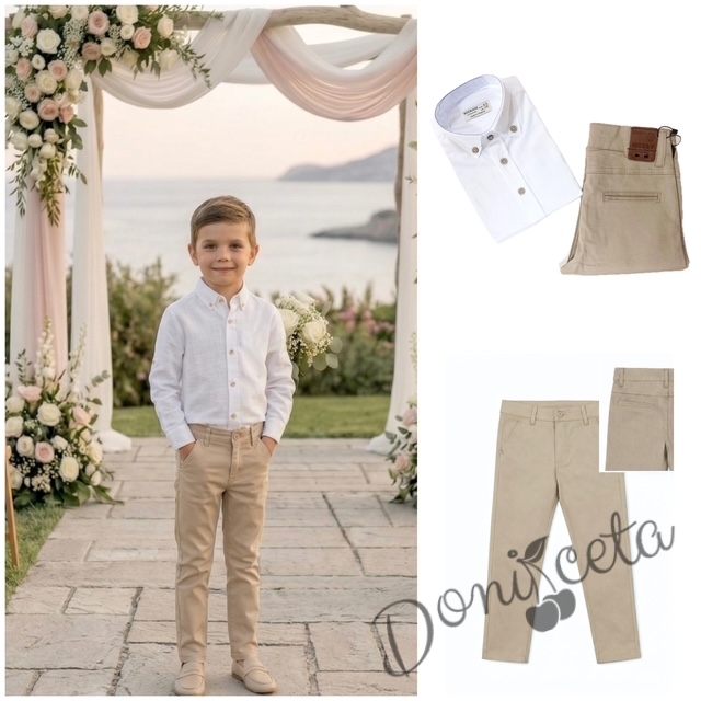 Официален детски комплект за момче риза с дълъг ръкав в бяло с яка и копчета в бежово и панталон в бежово