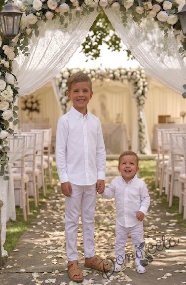 Представяме Ви нашия елегантен и стилен празничен комплект за момче от 2 части- риза в бяло с яка и панталон в бяло.
