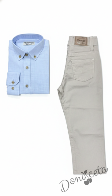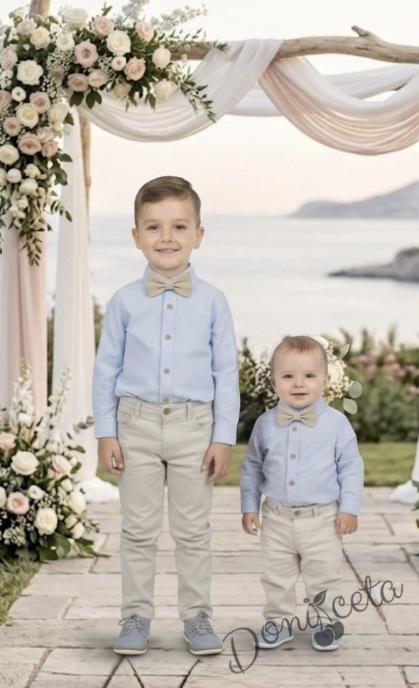 Детски комплект за момче от 3 части-риза в светлосиньо с яка, панталон в бежово и папийонка в бежово
