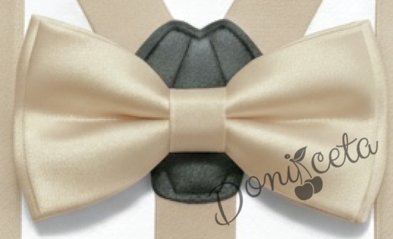 - Ризата е в светлосиньо като изпъква и се съчетава прекрасно с панталонаи с тиранти и папийонка в бежово.