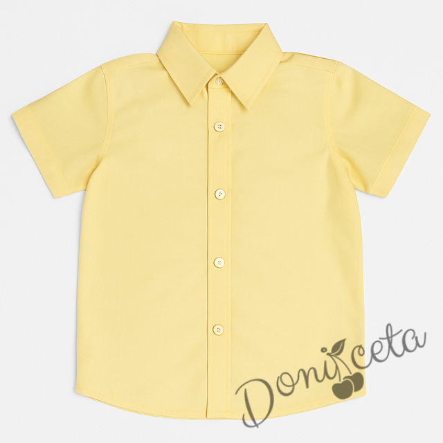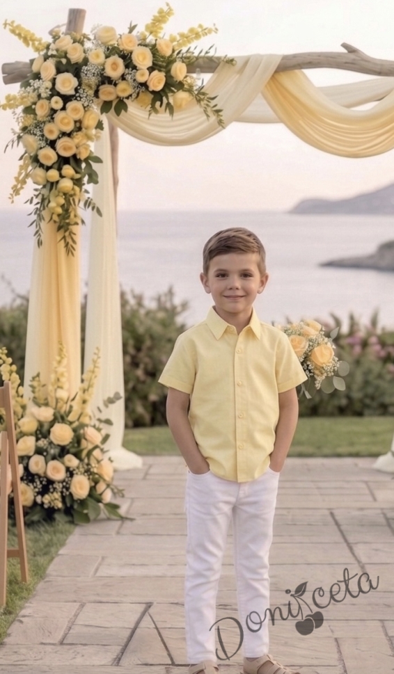 Летен комплект за момче от риза с къс ръкав в жълто и дълъг прав панталон в бяло