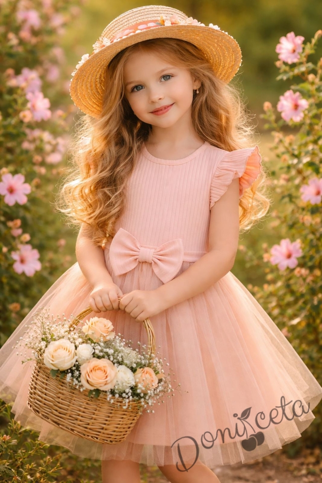 Ежедневна детска рокля с къс ръкав в прасковено с къдрички и тюл в долната част Оливия