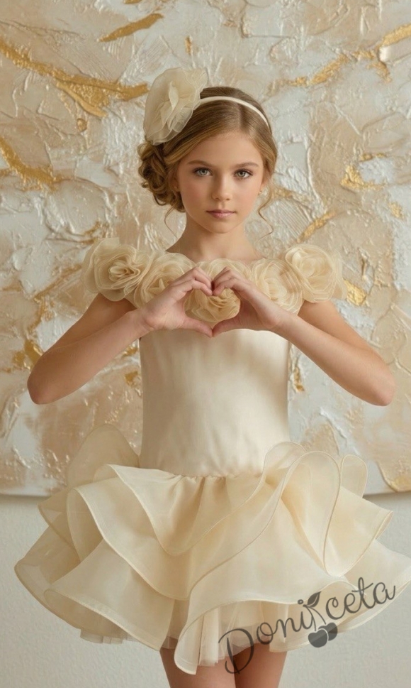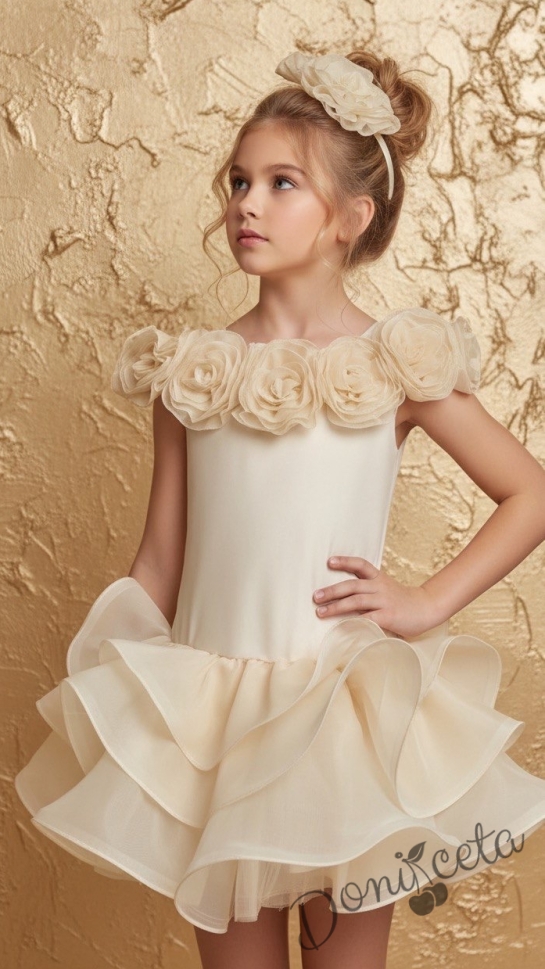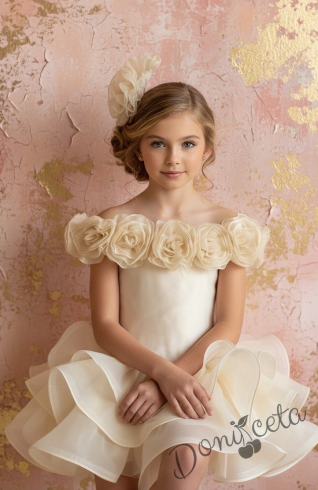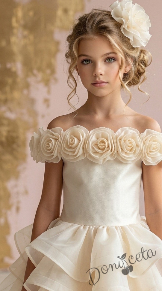 Къса елегантна детска рокля в екрю с рози и пищна многопластова пола Розалия