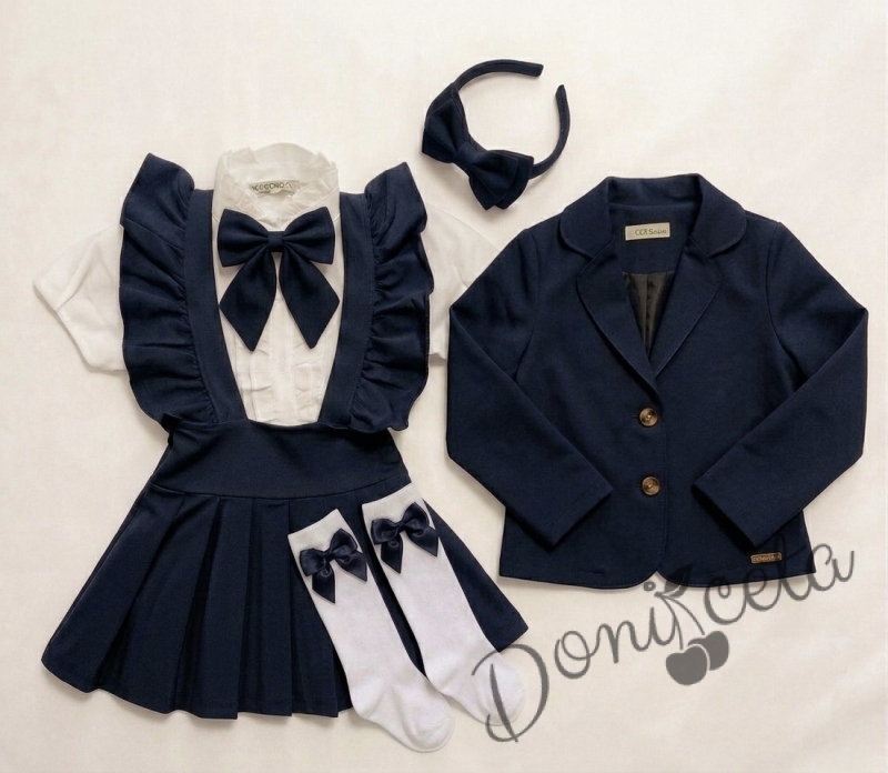 Комплект от 6 части сукман от трико Гери, сако в тъмносиньо, ризка в бяло с къс ръкав, чорапи с панделки, панделка в тъмносиньо за ризка и диадема