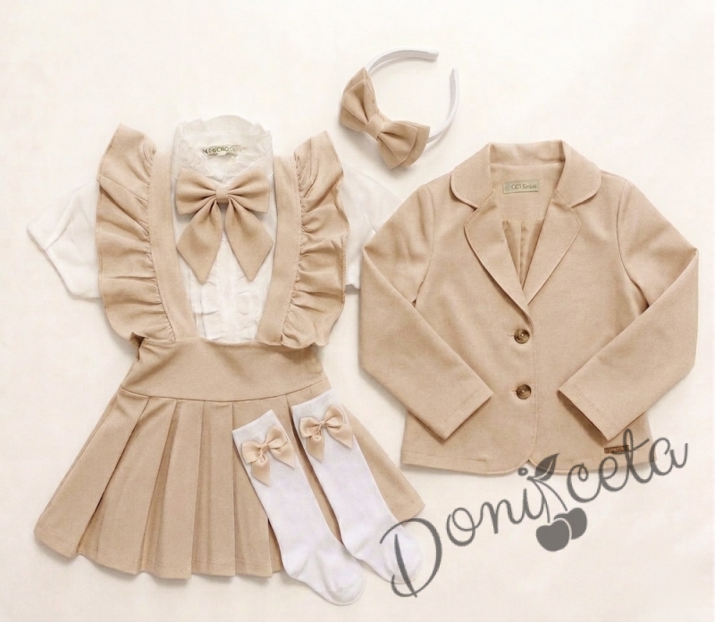 Комплект от 6 части сукман от трико Гери, сако в бежово, ризка в бяло с къс ръкав, чорапи с панделки, панделка в бежово за ризка и диадема