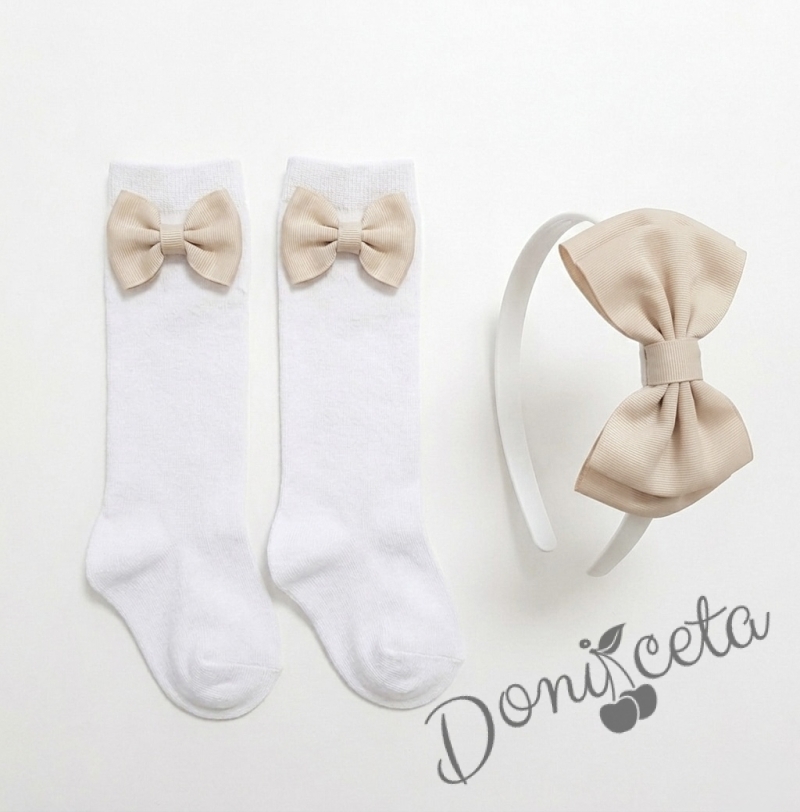 Комплект ръчно изработена диадема и чорапки с панделки в бежово