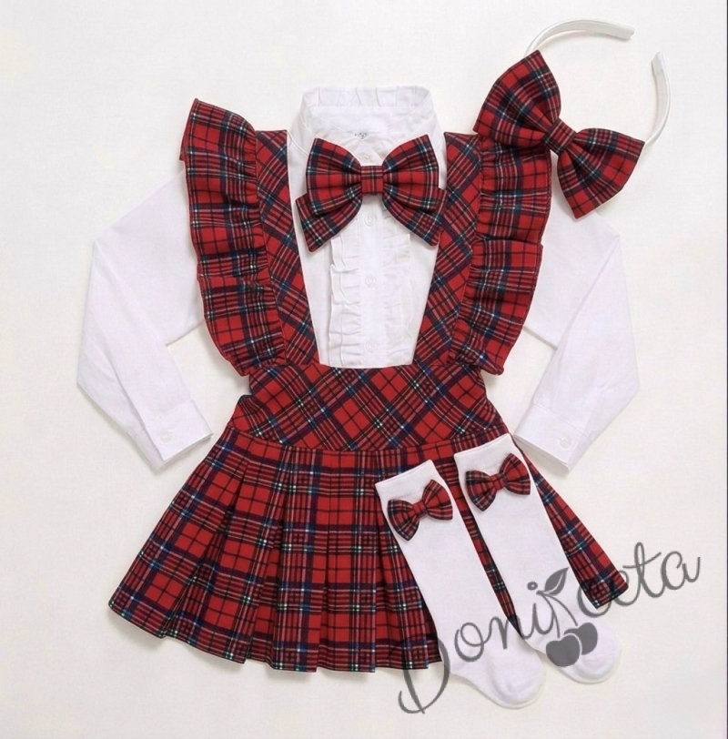 Комплект за момиче от 5 части- сукман Гери в червено каре с плисирана пола, риза в бяло с дълъг ръкав и къдрички ,панделка за ризка и чорапки и диадема в