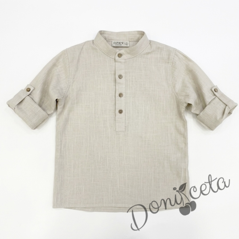Детска риза с дълъг ръкав за момче в бежово без яка с бежови копчета