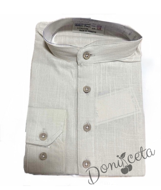 - Официална детска риза с дълъг ръкав за момче в бежово без яка с бежови копчета.