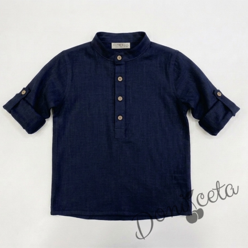 Детска риза с дълъг ръкав за момче в тъмносиньо без яка с бежови копчета