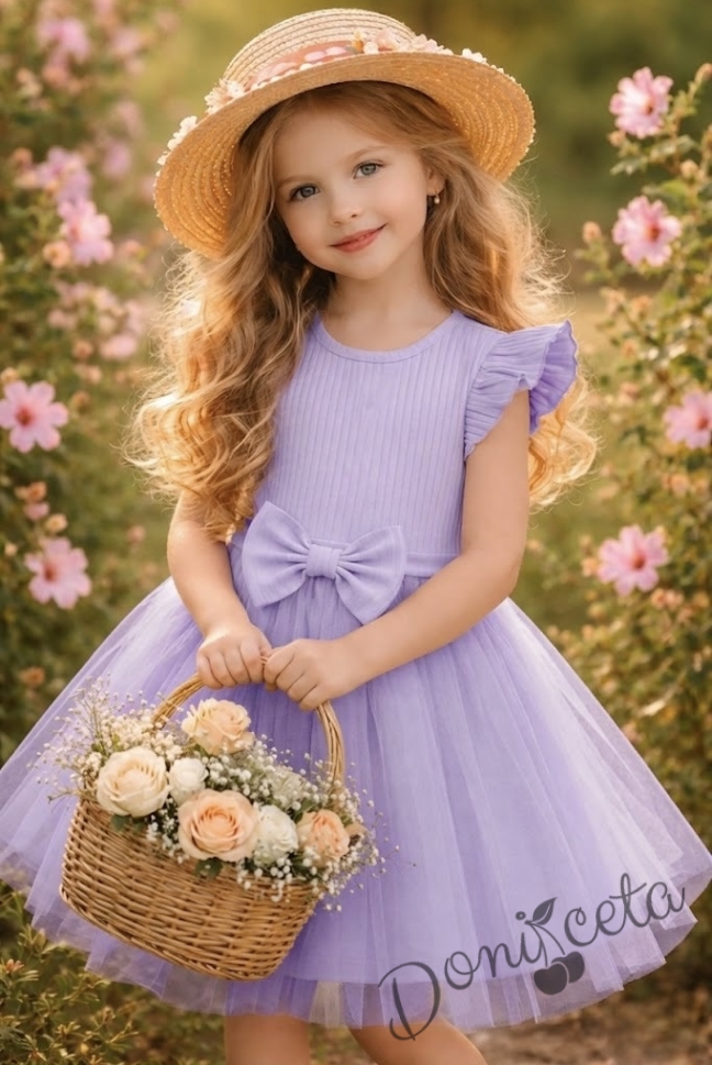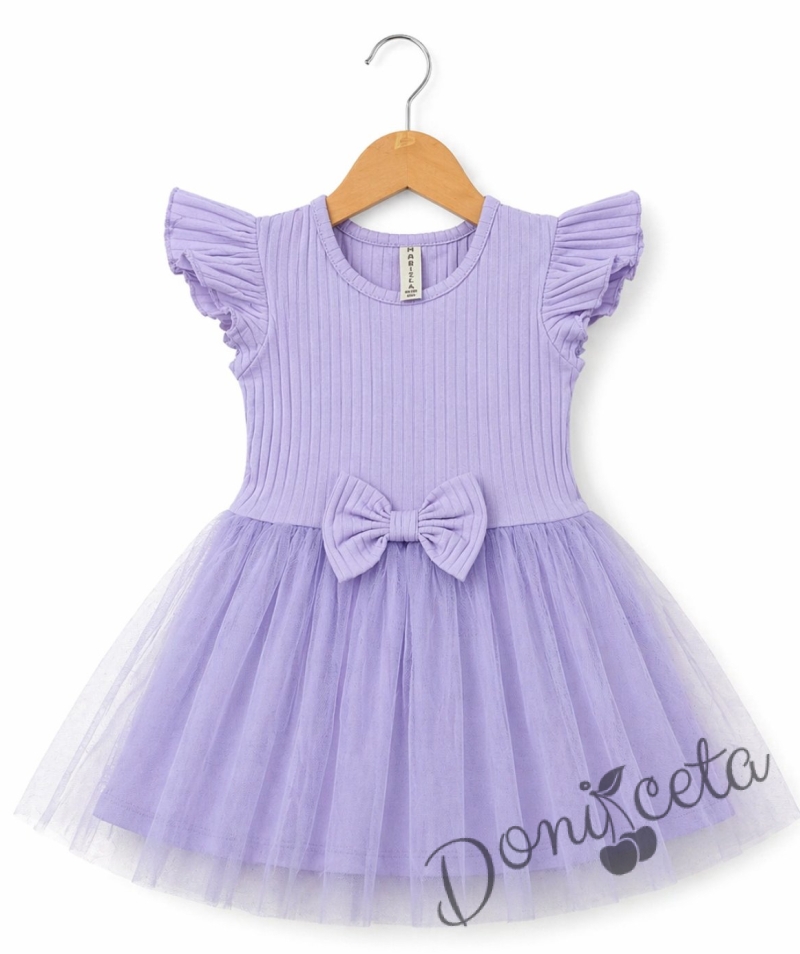 Ежедневна детска рокля с къс ръкав в лилаво с къдрички и тюл в долната част Оливия