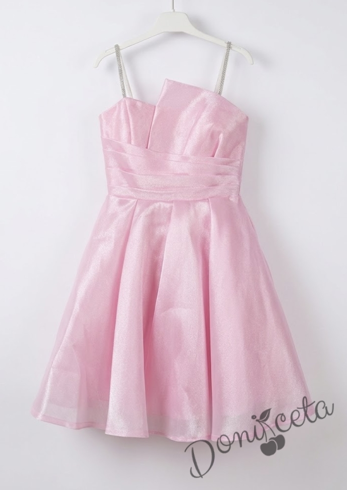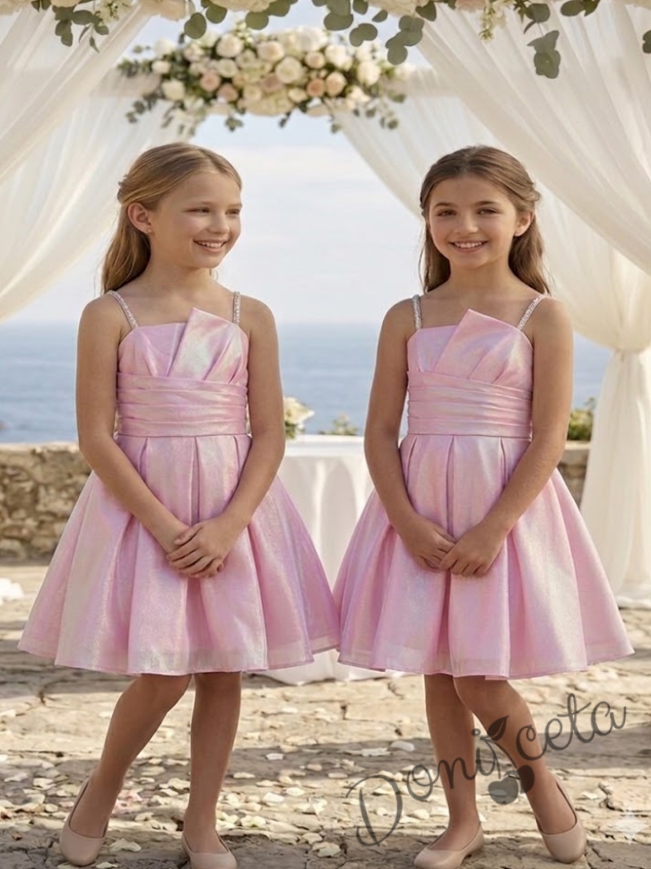 Начало МОМИЧЕТА Елегантна къса официална детска рокля Лара с асиметрично деколте в розово