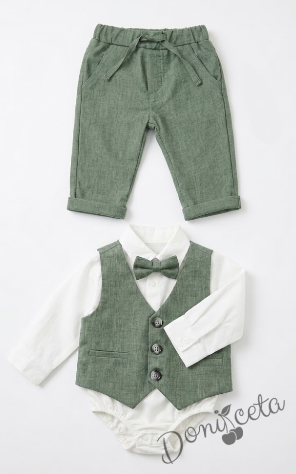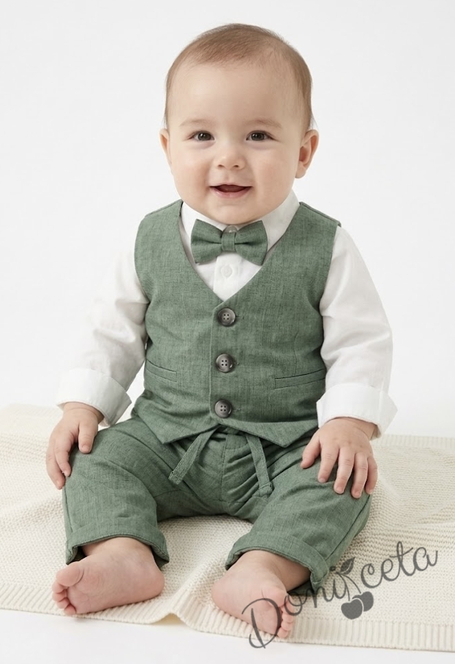 Бебешки официален комплект за момче от 4 части- боди риза в бяло, панталон, елек и папийонка в зелено от колекция Зелениада