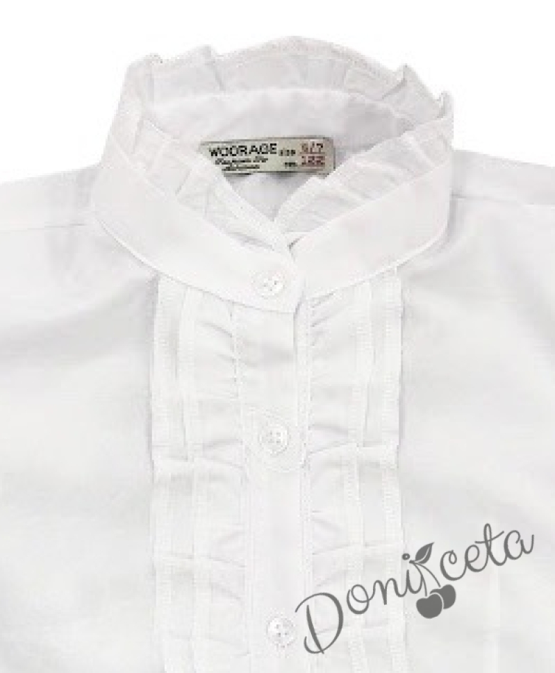 - Комплект от плисиран сукман с къдрички в бежово и ризка в бяло с къс ръкав и панделка в бежово, която може да се сваля