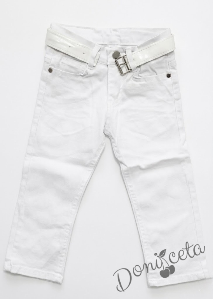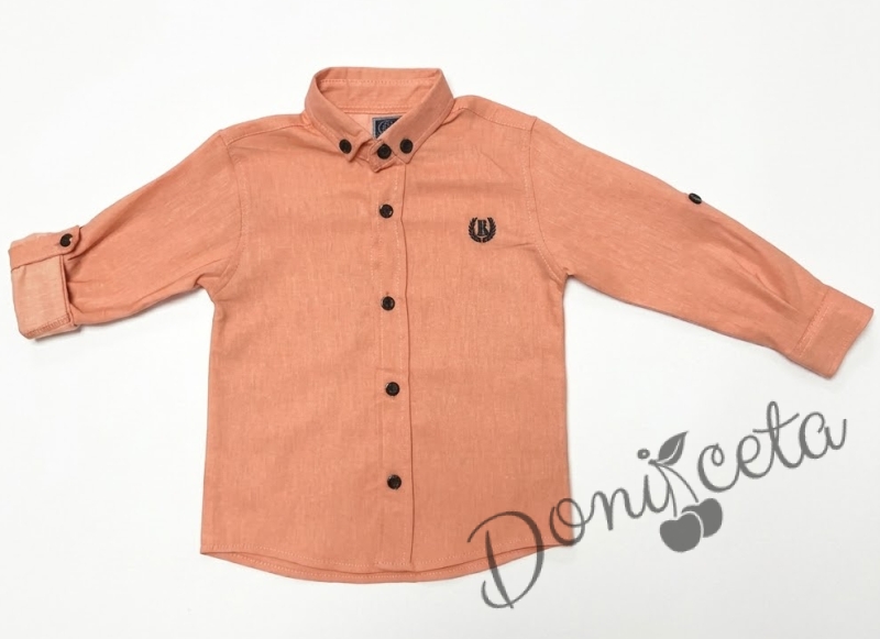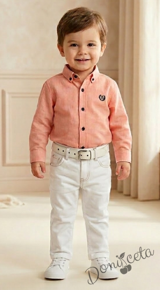 - Комплект от стилна детска риза с дълъг ръкав за момче в прасковено и бял панталон.