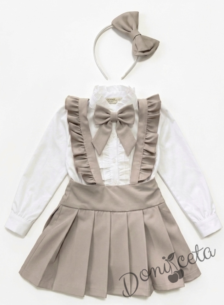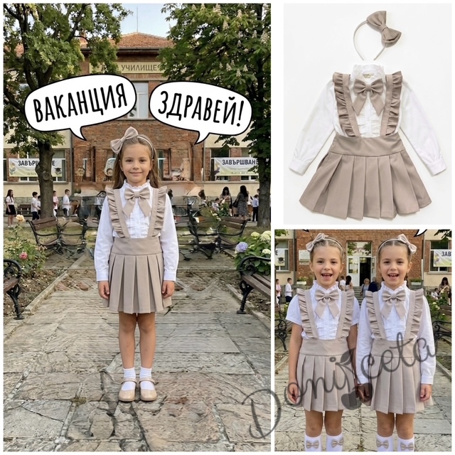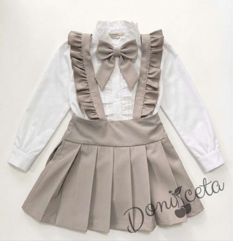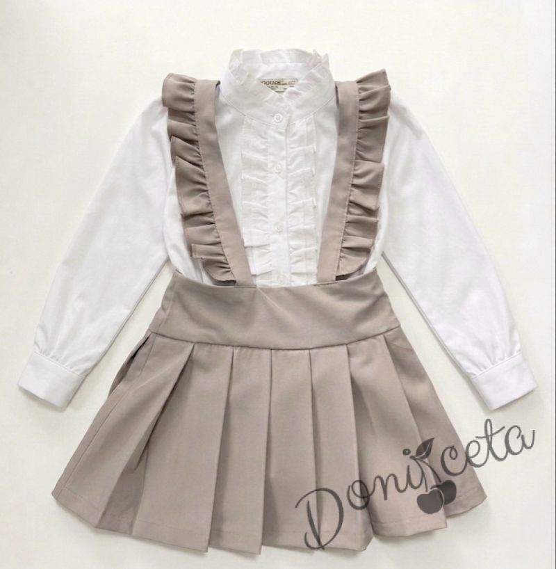 • Комплект от плисиран сукман с къдрички в бежово, блузка в бяло с дълъг ръкав с панделка, която се сваля от плата на сукмана.