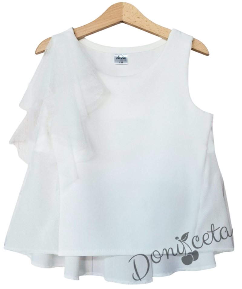 Представяме ви нашата модерна блузка без ръкав с панделка в нежен екрю цвят! Тази стилна блузка е идеалното допълнение към гардероба на вашата принцеса, предлагайки както комфорт, така и елегантност.