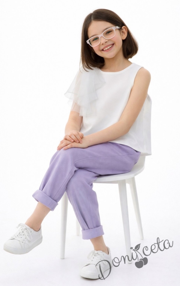 Детски спортно-елегантен панталон за момиче в лилаво с висока талия и колан