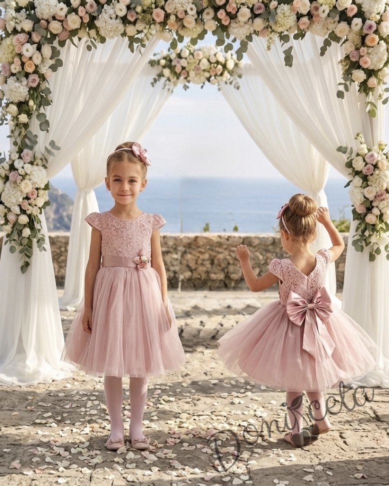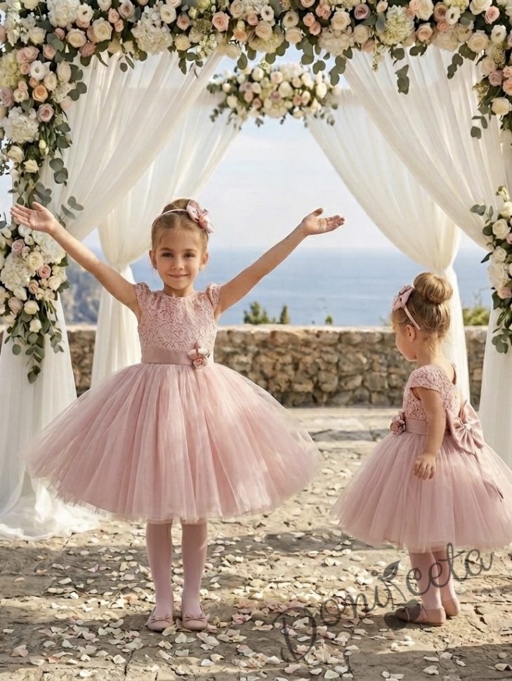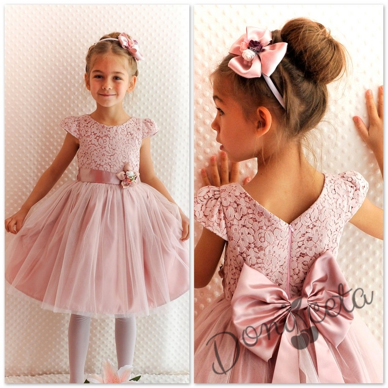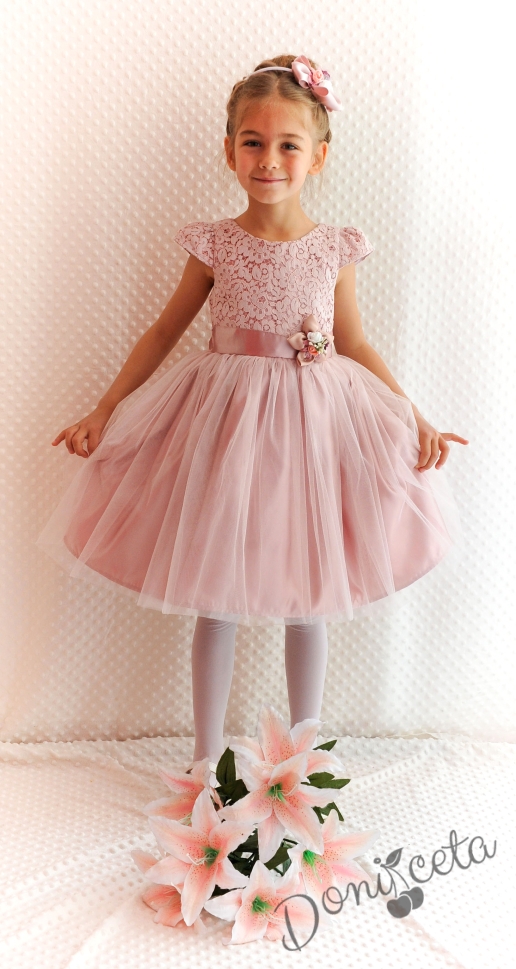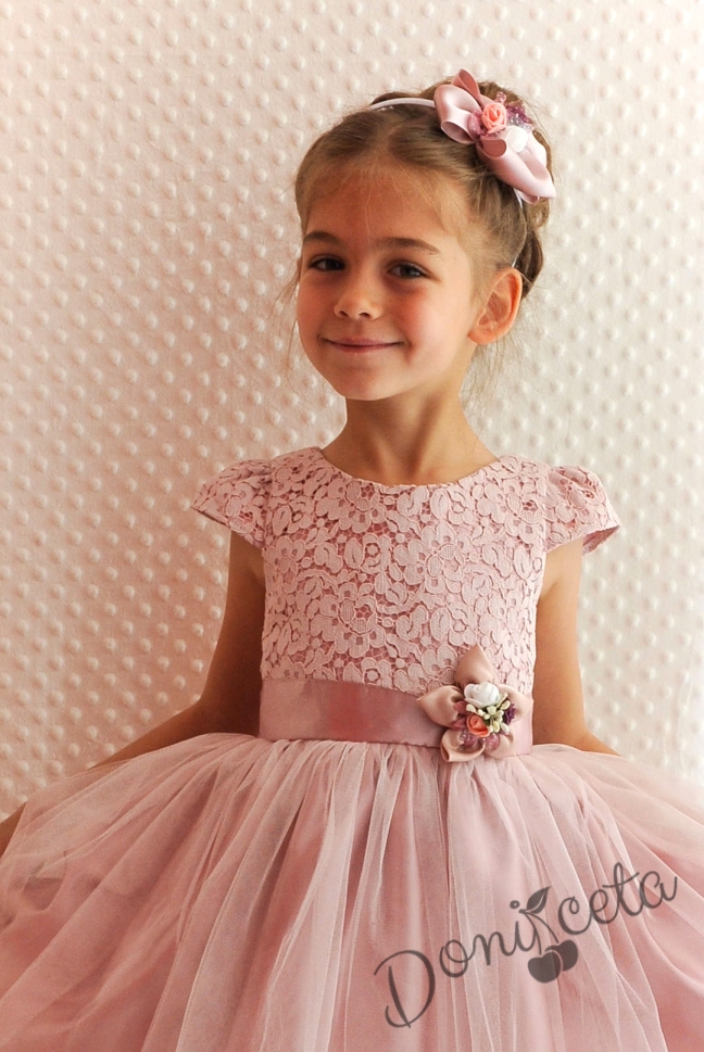 Изключително красива детска рокля за малки и големи принцеси в пепел от рози. Рокличката е с много нежна дантела в горната част и красив тюл надолу. Отзад е с голяма панделка. На кръста е с коланче и има красиво цвете. Горната част е с памучна подплата отвътре. Рокличката е подходяща за официални поводи-сватби, кръщенета, рождени дни! В нея всяко момиченце ще се почувства като истинска принцеса! *Моля имайте предвид, че цената се променя според размера!