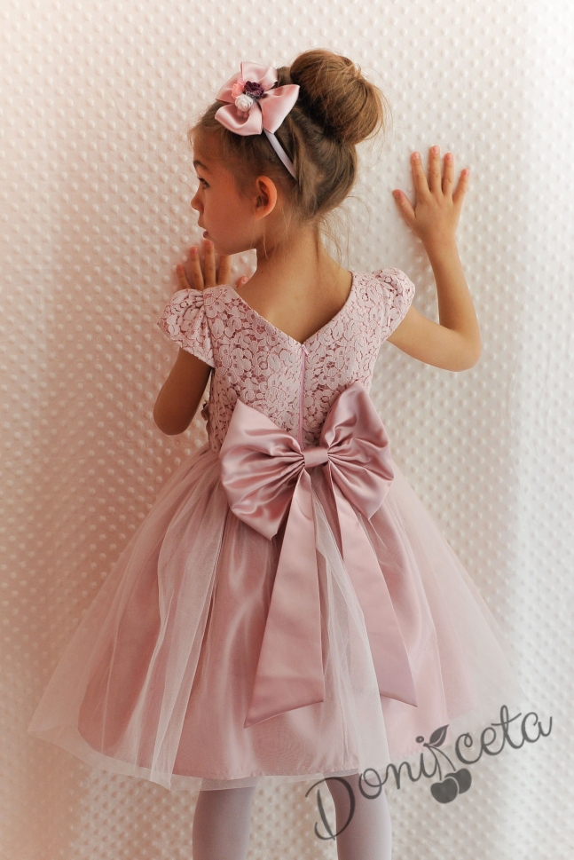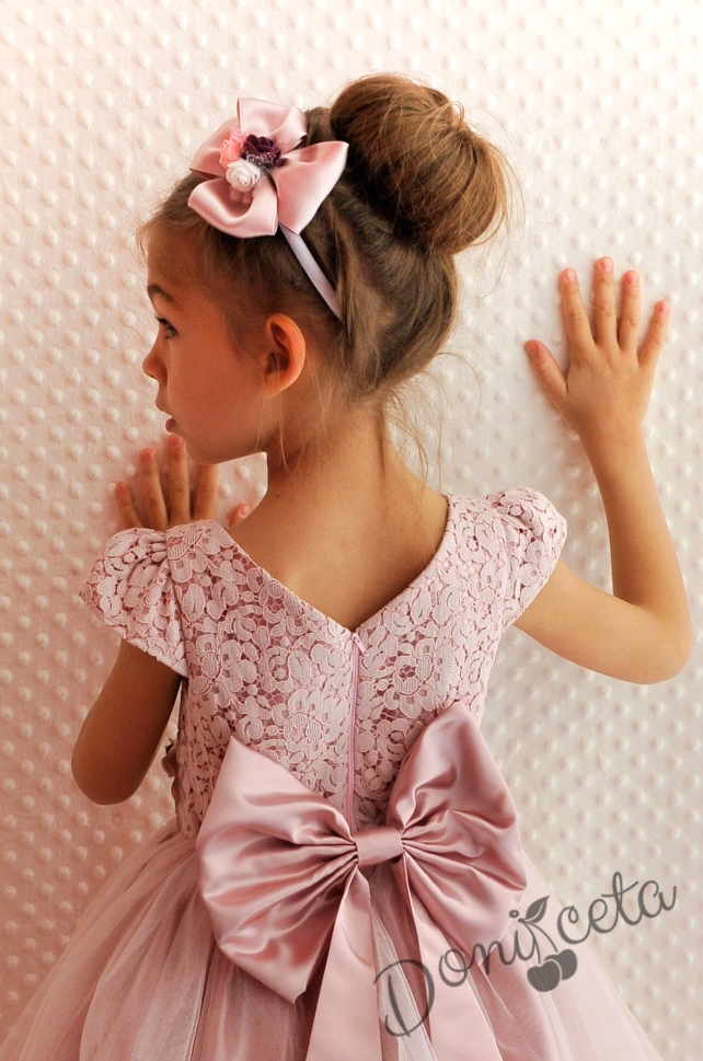 Официална детска рокля с дантела и тюл Златина в пепел от рози и голяма панделка на гърба278ФГТ
