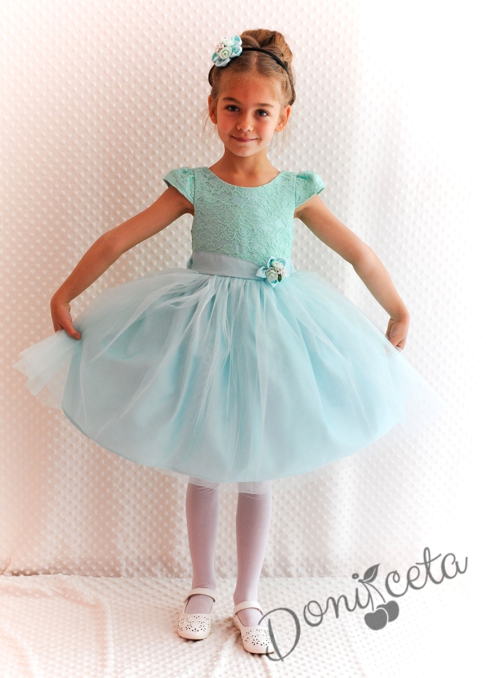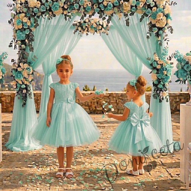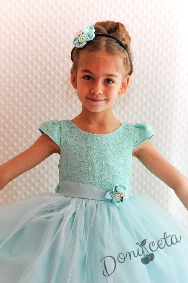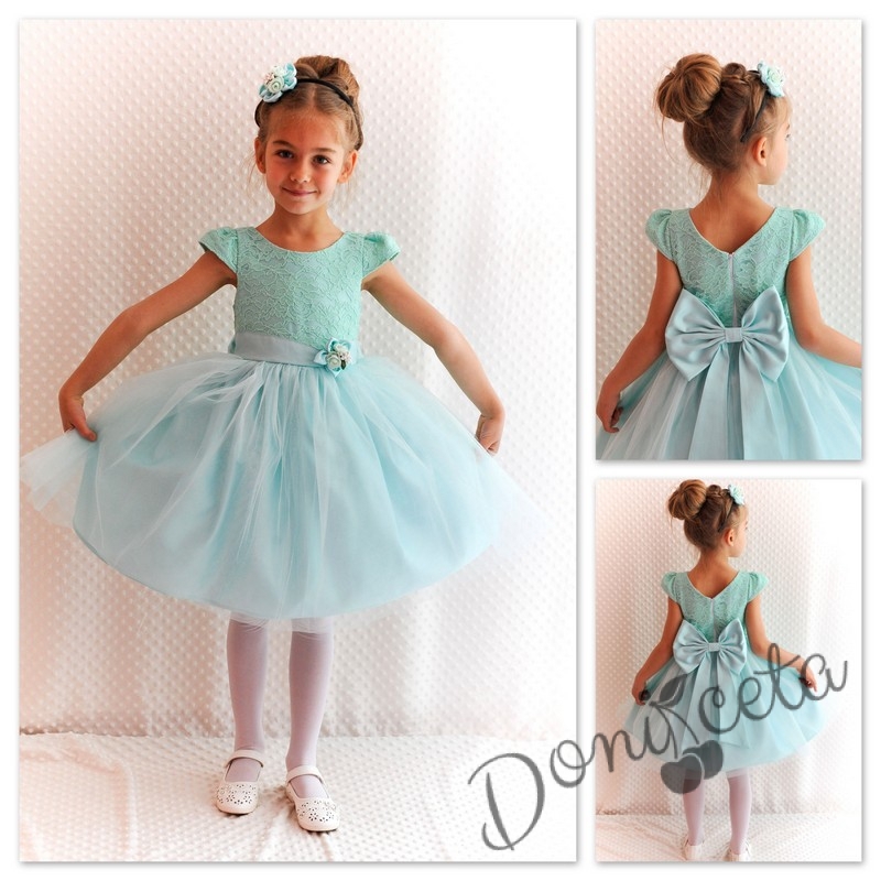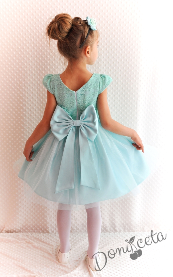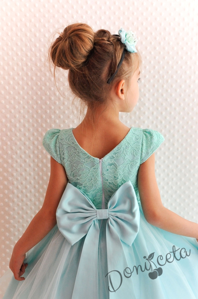 Официална детска рокля Златина в тюркоаз, мента с дантела и тюл и голяма панделка на гърба