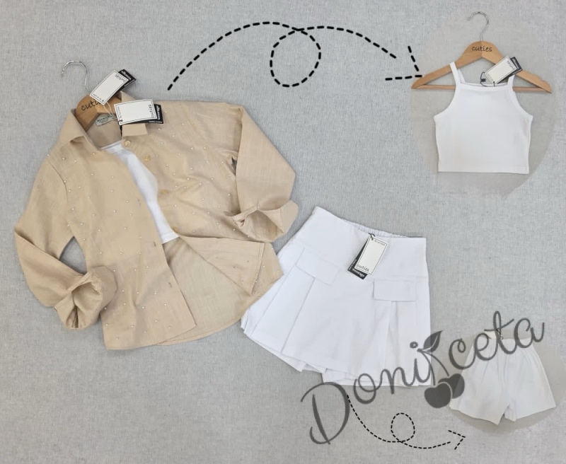 Комплект за момиче от 3 части - риза с дълъг ръкав в бежово, бял топ и пола-панталон в бяло