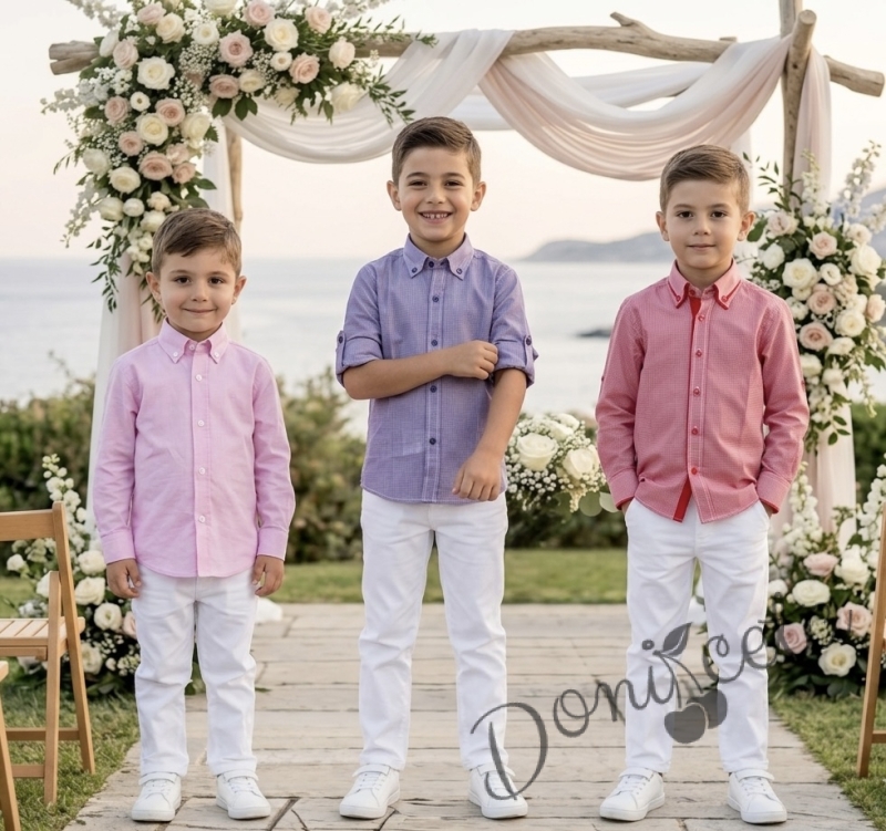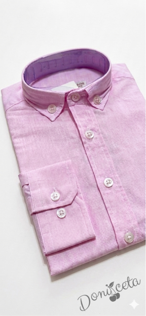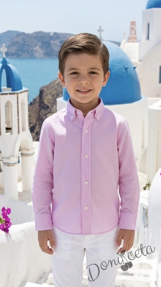 - Официална детска риза с дълъг ръкав за момче в розово с бели копчета.