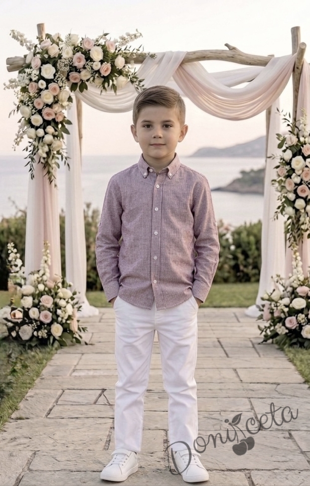 Детски комплект за момче от 2 части-риза с дълъг ръкав в пепел от рози на райе с яка и панталон в бяло