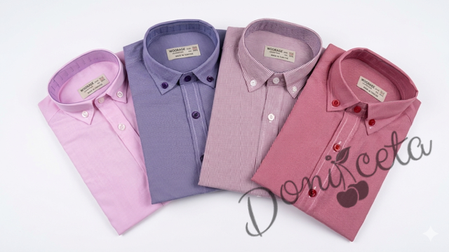 Представяме Ви нашия елегантен и стилен празничен комплект за момче от 2 части- риза в розово с яка и панталони в бяло.