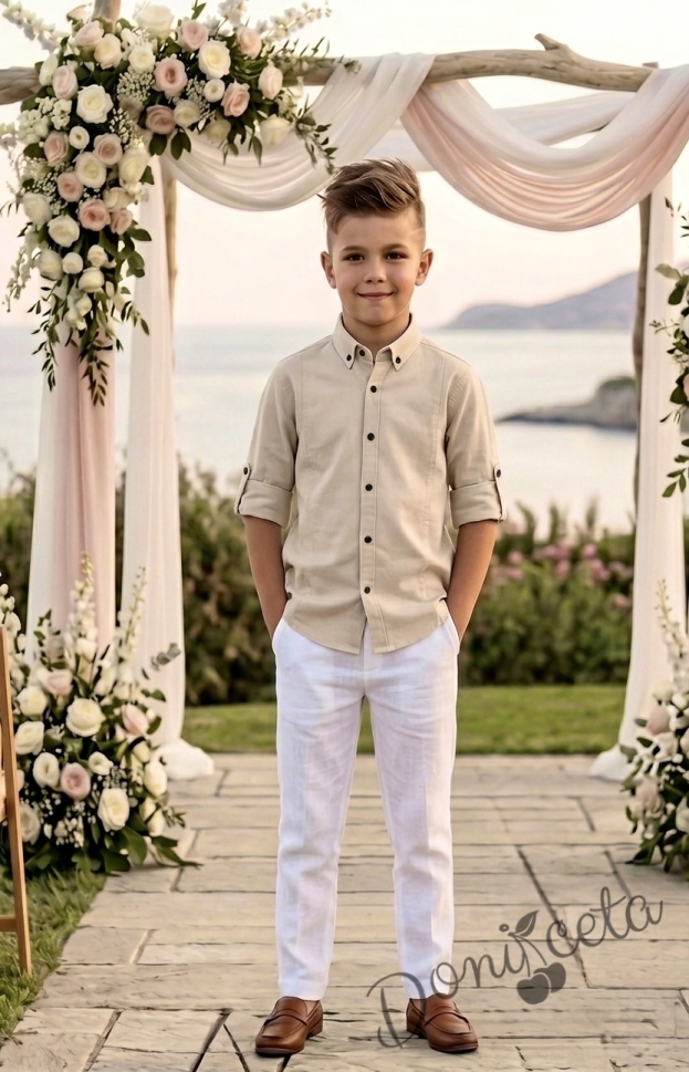 Представяме Ви нашия елегантен и стилен празничен комплект за момче от 2 части- риза в бежово с яка и панталони в бяло.