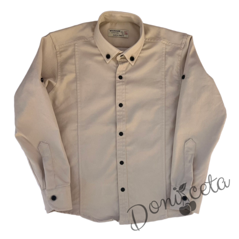 Детски комплект за момче от 2 части-риза с дълъг ръкав в бежово с яка с копчета в черно и панталон в бяло