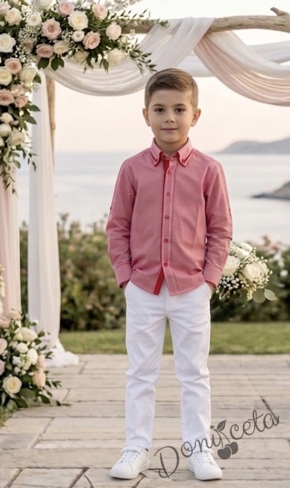 Представяме Ви нашия елегантен и стилен празничен комплект за момче от 2 части- риза в червено с яка и панталони в бяло.