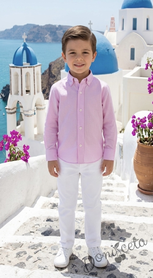 Представяме Ви нашия елегантен и стилен празничен комплект за момче от 2 части- риза в розово на черти с яка и панталони в бяло.