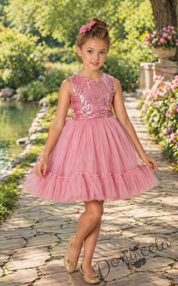 Официална детска рокля в нежен розов цвят без ръкави с пайети и тюл на много пластове