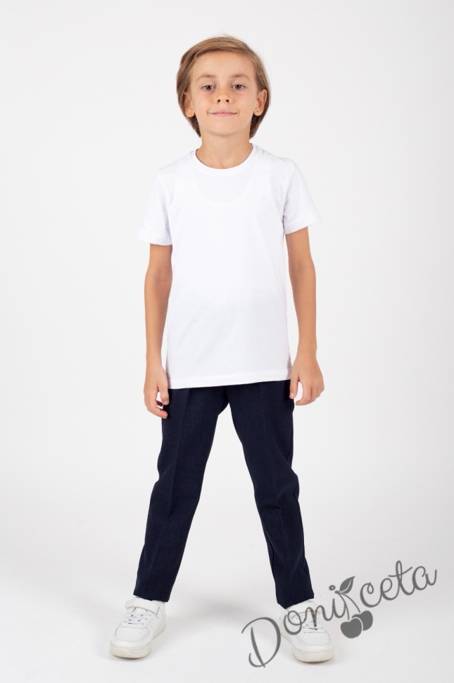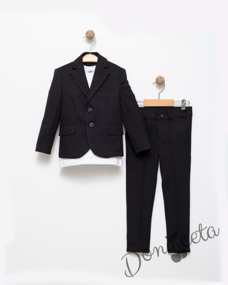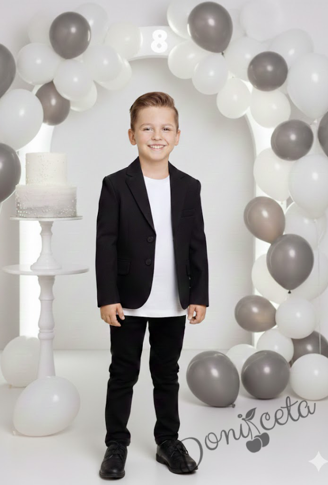 Спортно-елегантен комплект за момче от 3 части - тениска с къс ръкав в бяло със сако в черно и панталон в черно