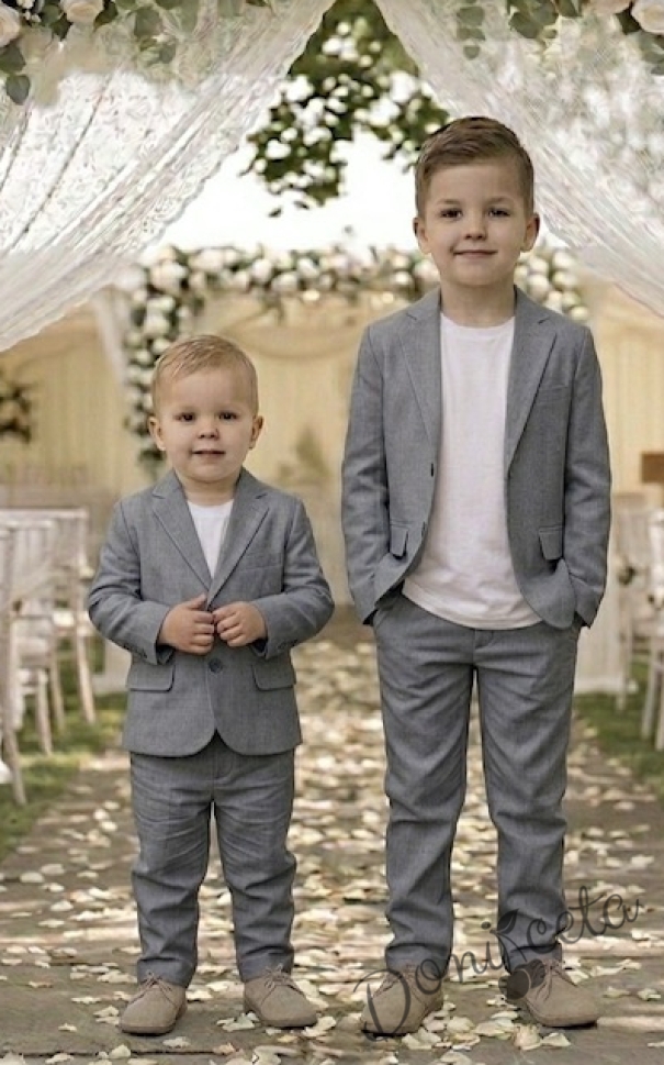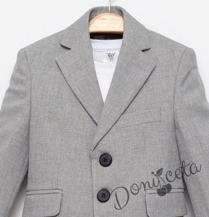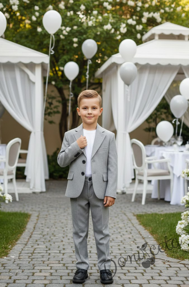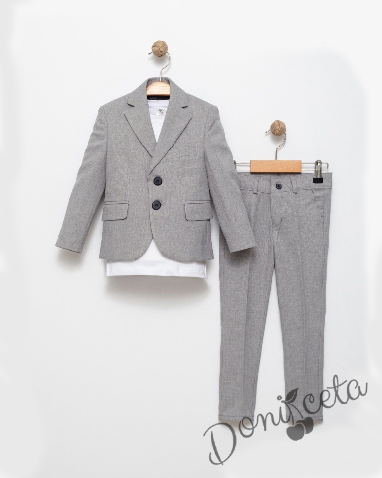 Спортно-елегантен комплект Сивина за момче от 3 части-тениска с къс ръкав в бяло, сако в сиво и панталон в сиво