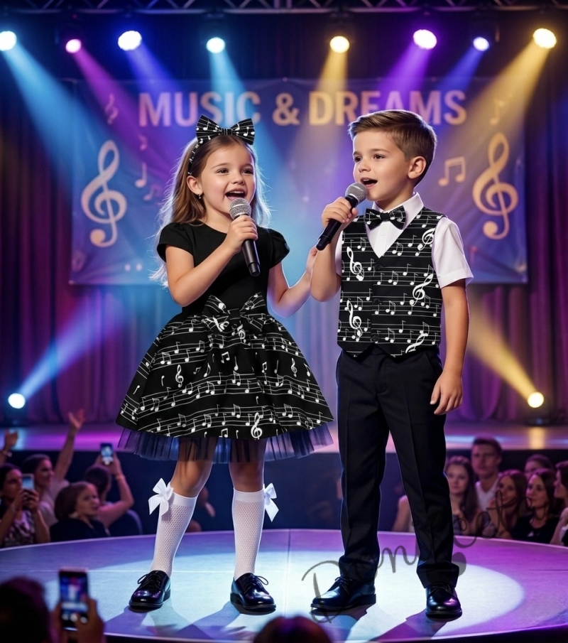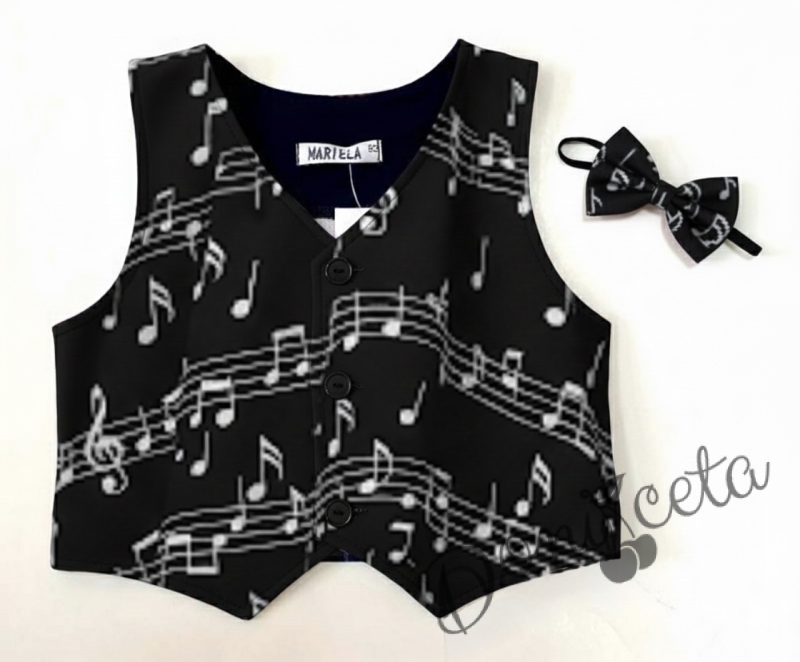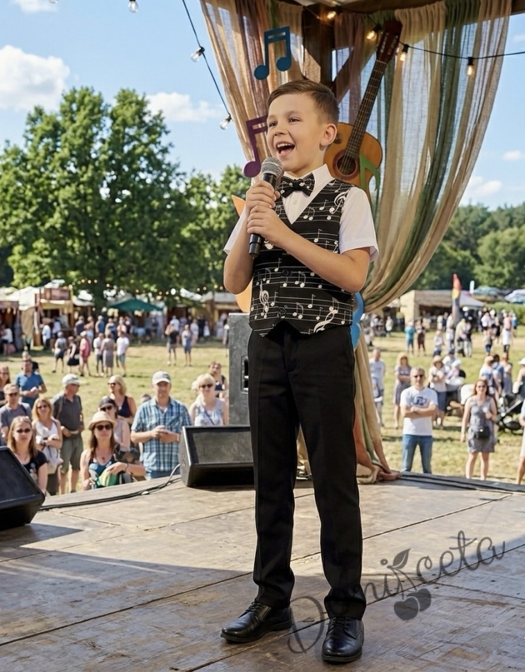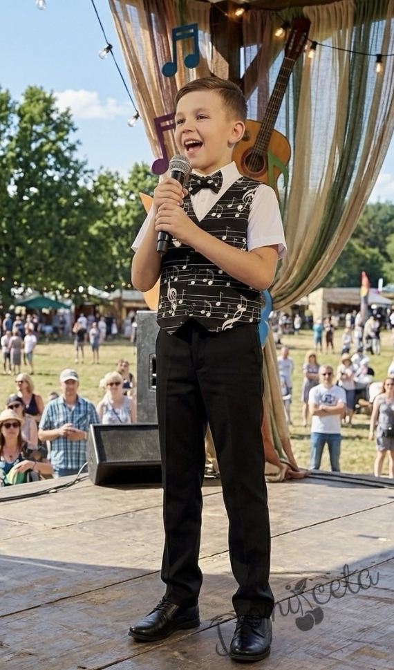 - Много стилен комплект за момче от ризка в бяло с къс ръкав, елегантен панталон в черно и елек в черно с ноти и папийонка.