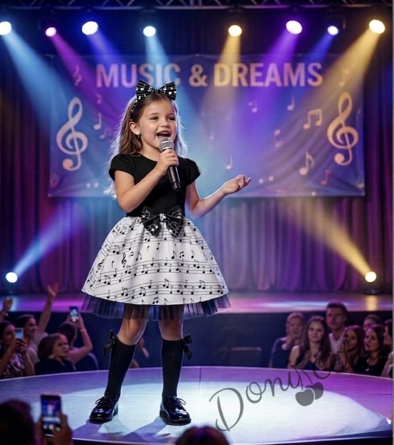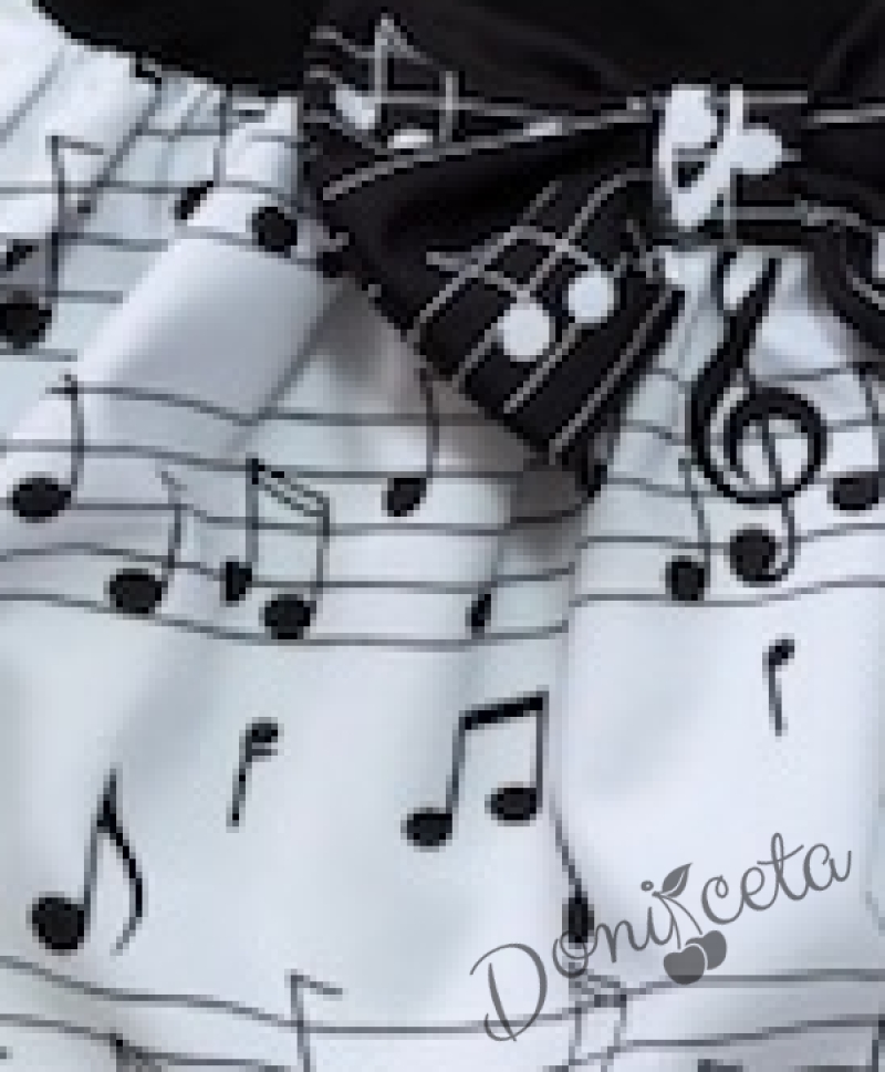 Детска рокля с къс ръкав в черно с бяла долна част с ноти и тюл в черно