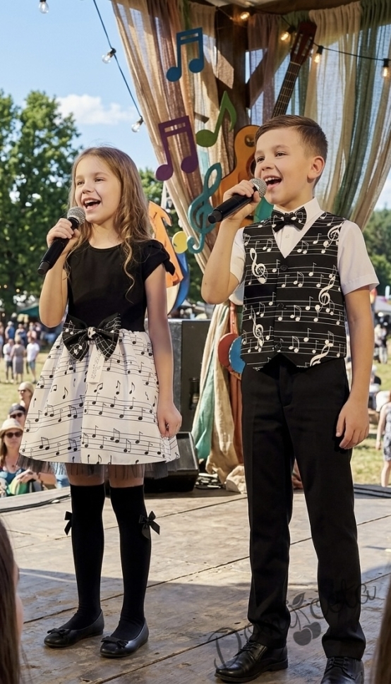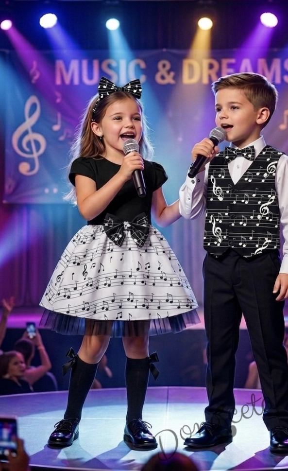 Празничен коплект от детска рокля в бяло с черни ноти и болеро в черно