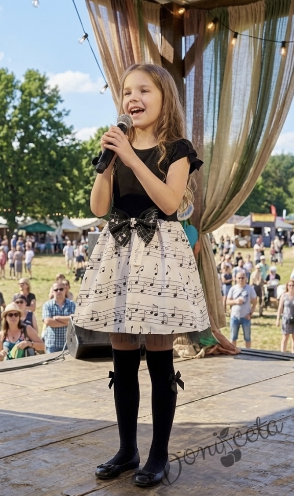 Детска рокля с къс ръкав в черно с бяла долна част с ноти в черно и тюл в черно