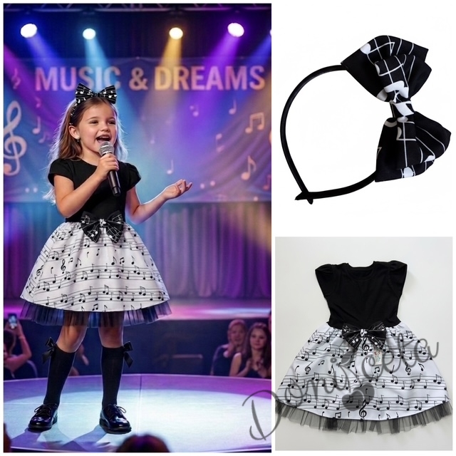 Комплект от 2 части-детска официална рокля с къс ръкав в черно с бяла долна част с ноти с тюл в черно и диадема