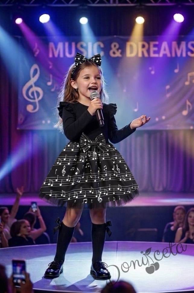 Детска официална рокля с дълъг ръкав в черно с къдрички на ръкавите и ноти и тюл в долната част