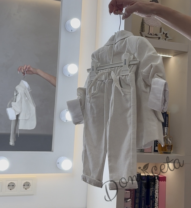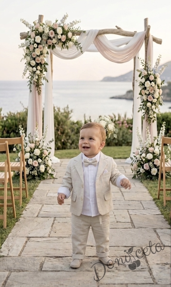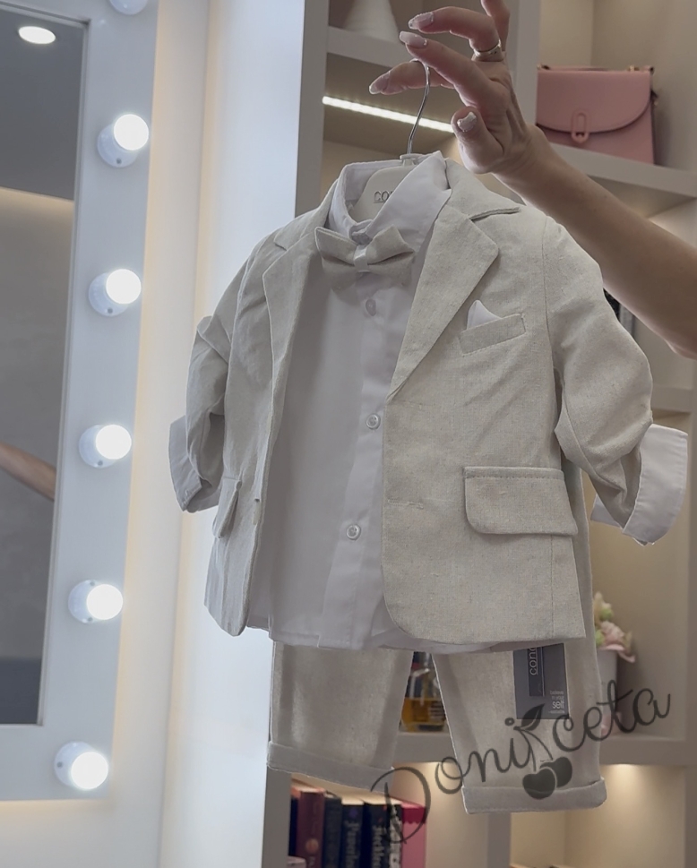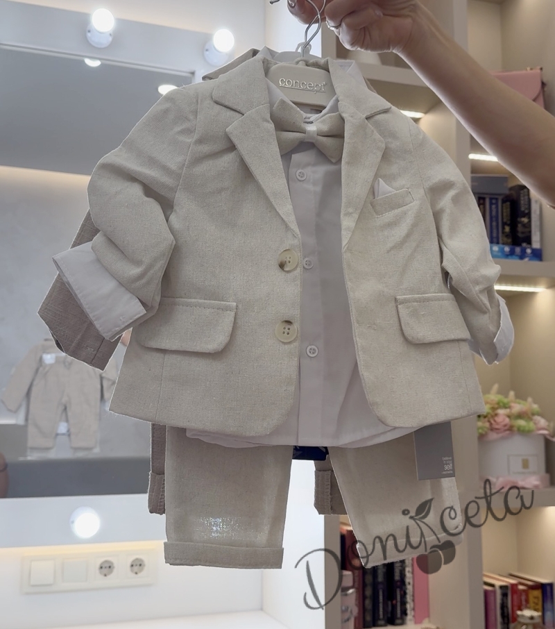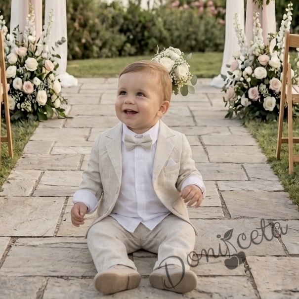 Бебешки летен костюм за момче от 4 части в светлобежово - сако, риза в бяло, панталон и папийонка в екрю