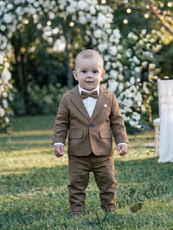 Летен бебешки тънък костюм от 4 части за момче-сако в кафяво, боди-риза в бяло и панталон в кафяво и папийонка