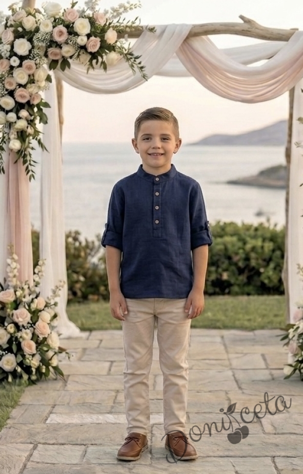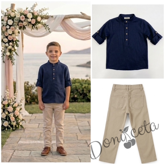 Детски комплект за момче от 2 части-риза с дълъг ръкав в тъмносиньо без яка с копчета в бежово и панталон в бежово