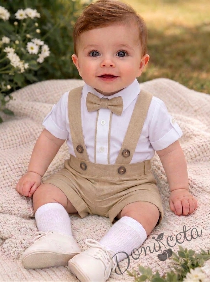 Комплект за бебе момче от 3 части - боди риза в бяло с дълъг ръкав с възможност за навиване ,къси панталони тип гащеризон и папийонка в бежов цвят