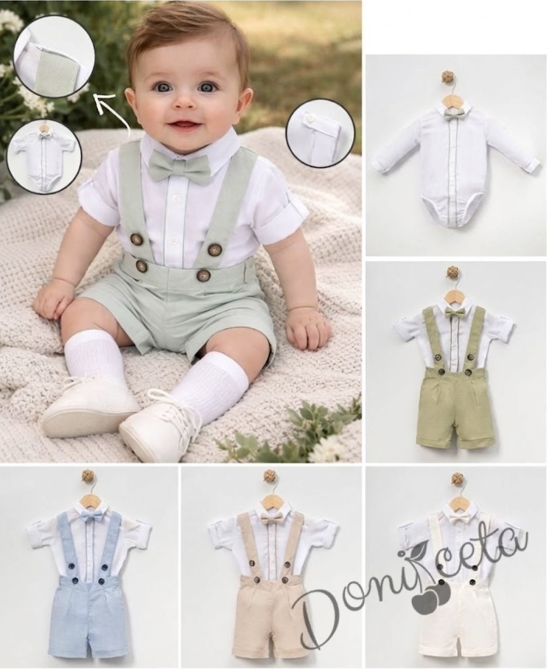 • Комплект за момче от 3 части - боди риза в бяло с дълъг ръкав , който може да се навие, къси панталони тип гащеризон и папийонка в светлосин цвят.