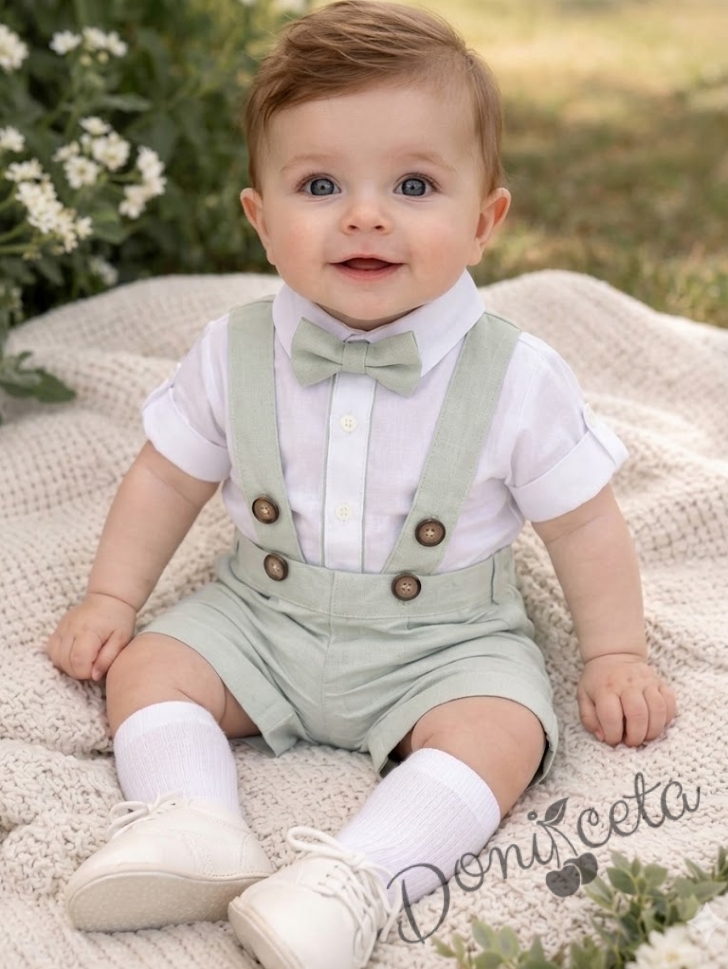Комплект за бебе момче от 3 части - боди риза в бяло с дълъг ръкав с възможност за навиване ,къси панталони тип гащеризон и папийонка в светлозелен цвят