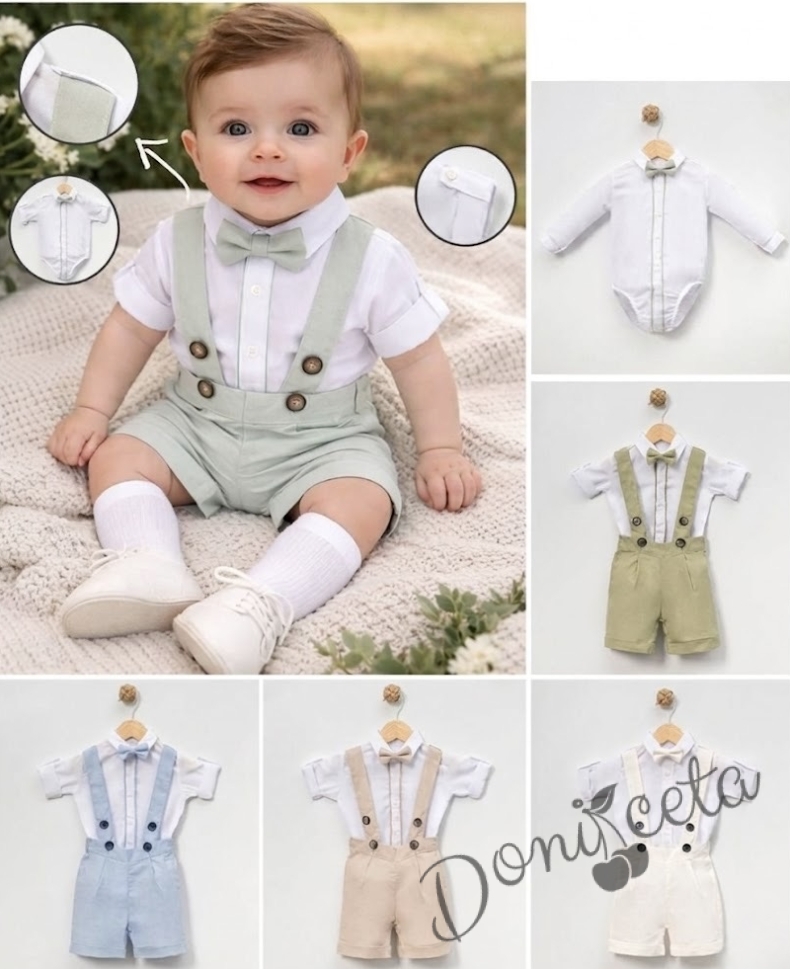 - Комплект за момче от 3 части - боди риза в бяло с дълъг ръкав , който може да се навие, къси панталони тип гащеризон и папийонка в светлозелен цвят.