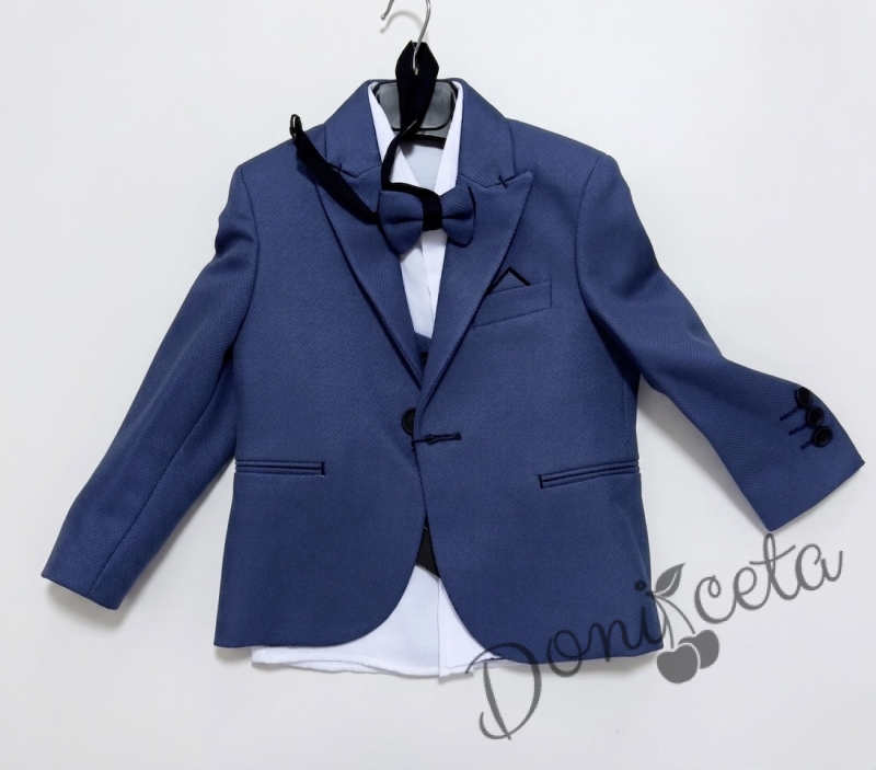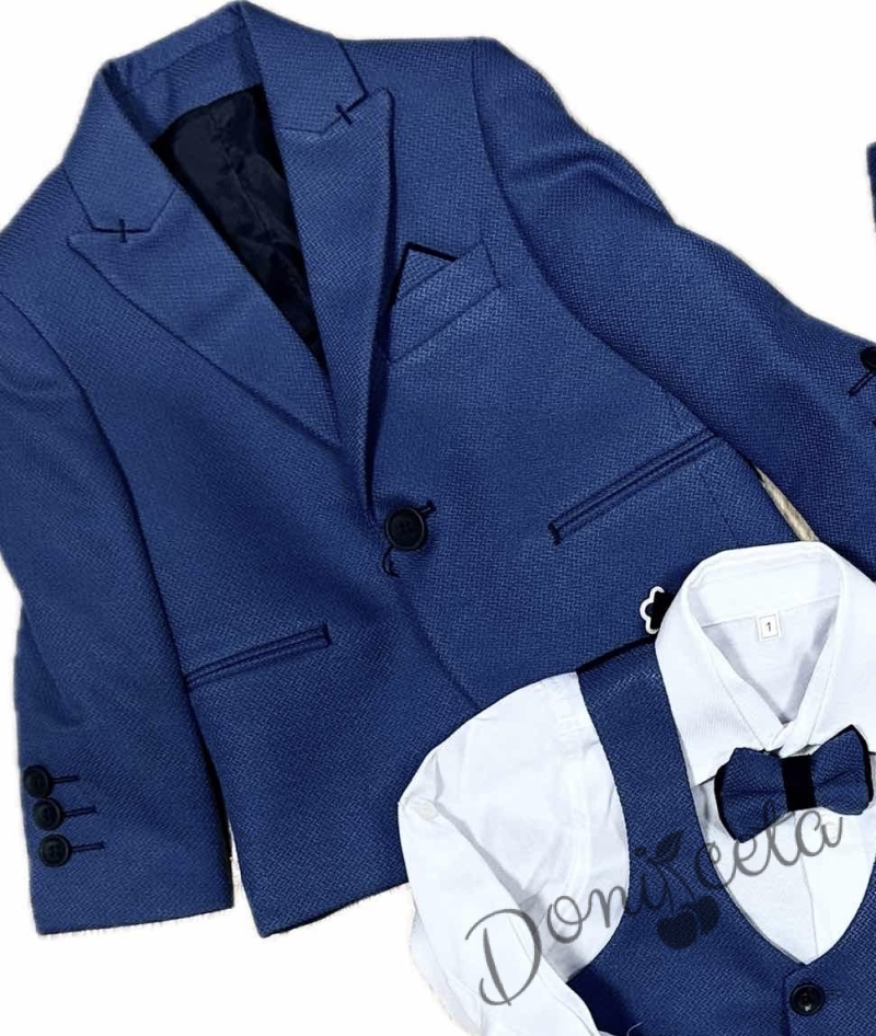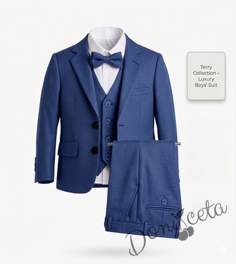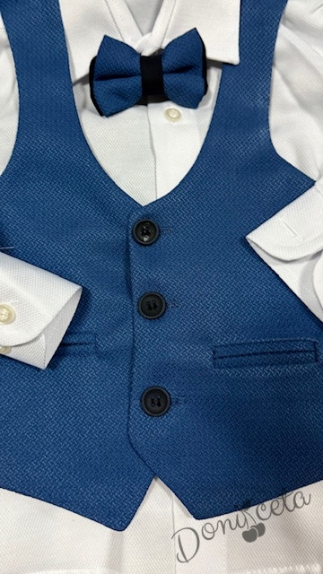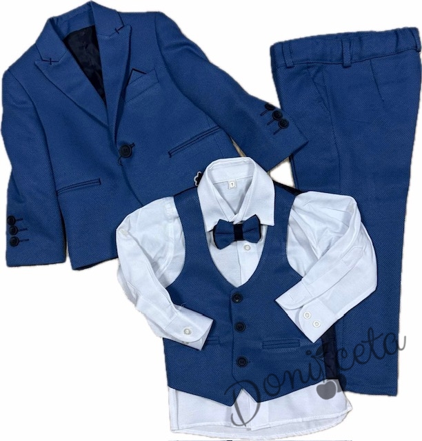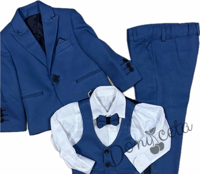 Официален детски костюм за момче от 5 части в кралско синьо - сако, панталон, риза, елек с един ред копчета и папийонка от колекция Кралина